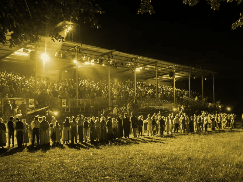 La mise en scène de La Cassine est inédite. La tribune mobile et couverte suit les personnages sur 300 mètres, du Couvent des Cordeliers aux ruines du château. Cette mobilité transforme le spectateur en témoin actif de l’histoire, immergé au plus près de l’action. Chaque scène devient un moment unique, où le décor naturel et historique de l’Ardenne magnifie la narration.